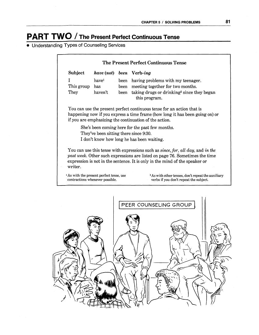 [3] Part Two on pages 81-85 focuses on forms and uses of The Present Perfect Continuous. Study the pedagogy; compose statements, questions, and answers; Tense, and contrast this “doubled aspect” tense with the Present Perfect.