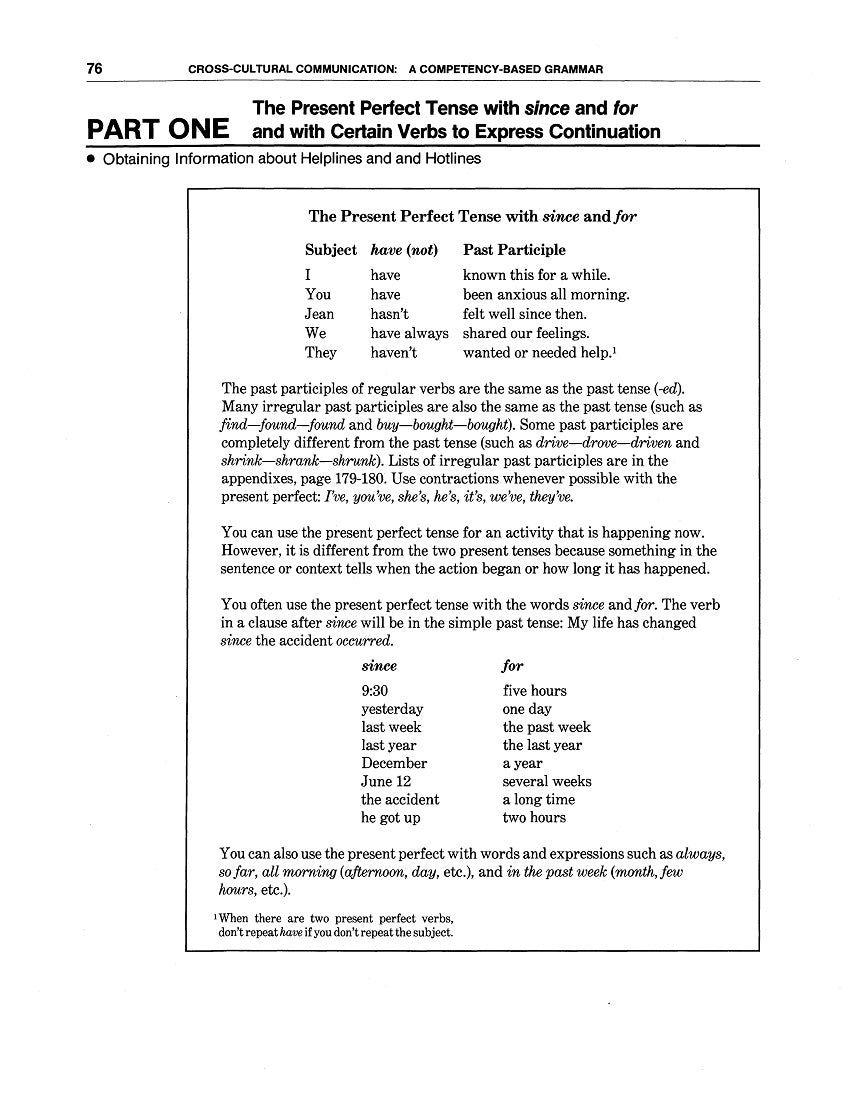 [2] In Part One on pages 76-80, learn how to use “The Present Perfect with since & for to Express Continuation.” Contrast verbs suggesting “onset of action”—like realize, become, get—with verbs like know, be, have, which connote “continuation.” When doing and checking Exercises A-D, consider the visualizing Time Charts.