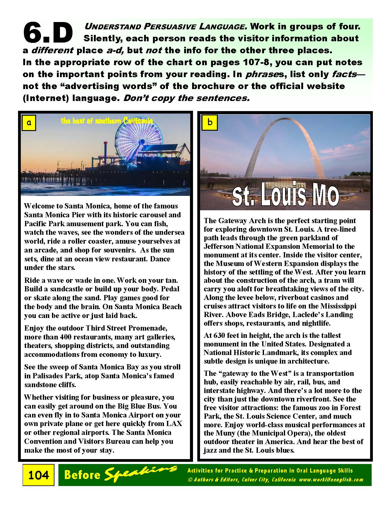 [2] In 6.C, Get & Give Info with Questions & Answers (About Monuments & Famous Sites). In 6.D, after Understanding Persuasive Language about four U.S. tourist attractions, you can again play the “Expert Game” by sharing factual description with others.