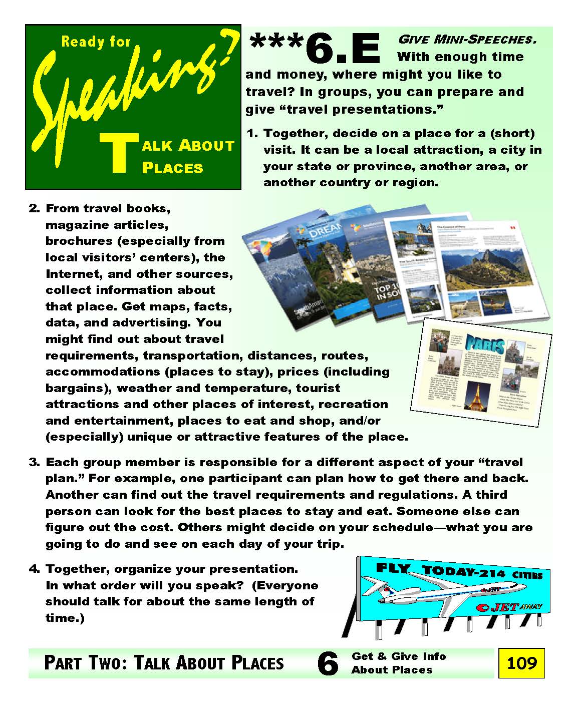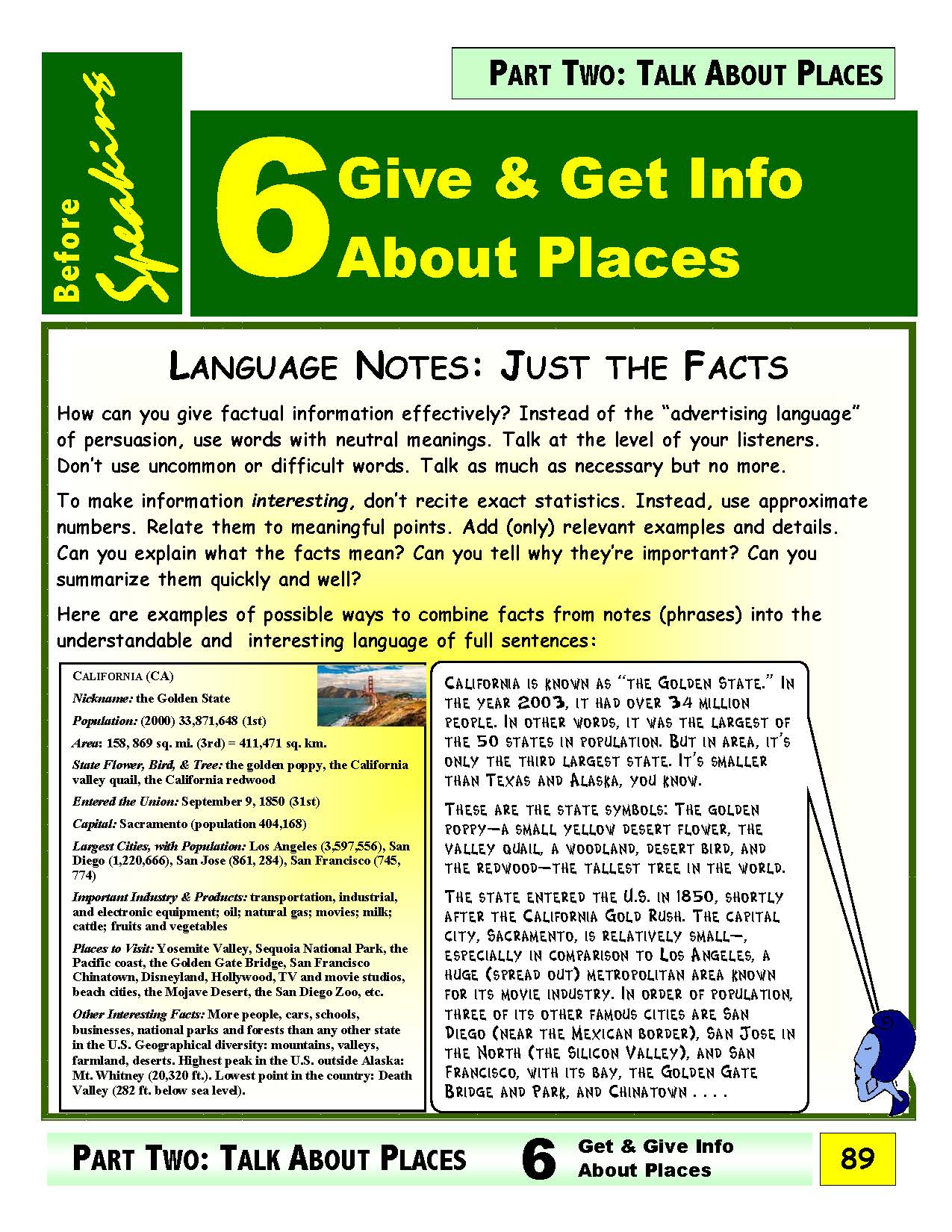 Before Speaking: Activities for Practice & Preparation in Oral Language Skills. Part Two, Talk About Places: 6: Give & Get Factual Information, pages 89-110 + 24 Answer Key Pages with Suggested (Model) Contributions to “Expert Game” Activities & Group Presentations