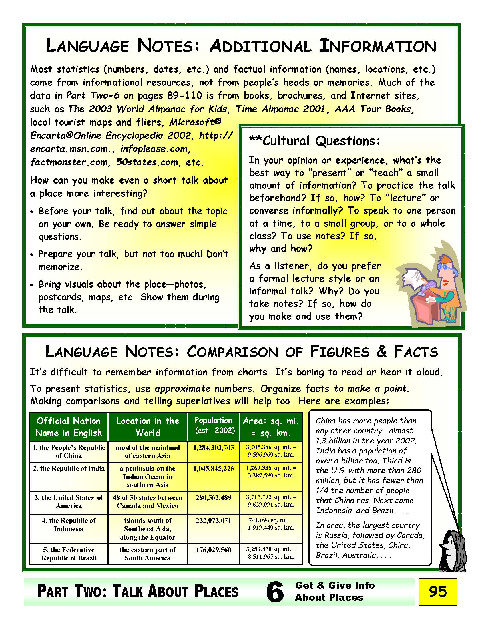 Why It’s Useful: The culmination of “Talk About Places” is likely to involve detailed info about landmarks, towns, cities, boundaries, nations, and more—including their names, locations in the world, populations, areas, languages, economics, etc. This Part Two-6 Download launches learning with informational U.S. States Learning Cards. It continues with Note-Taking in Grids, Figures & Facts about World Nations, Question & Answer Games about well-known world attractions and sites, and Visitor Information about places to visit. After Summary Vocabulary Lists, it ends with “Mini-Speeches” that are presentations of Travel Plans. Samples of these are among the suggested language compiled onto 24 pages from the Before Speaking Answer Key for Text Activities.