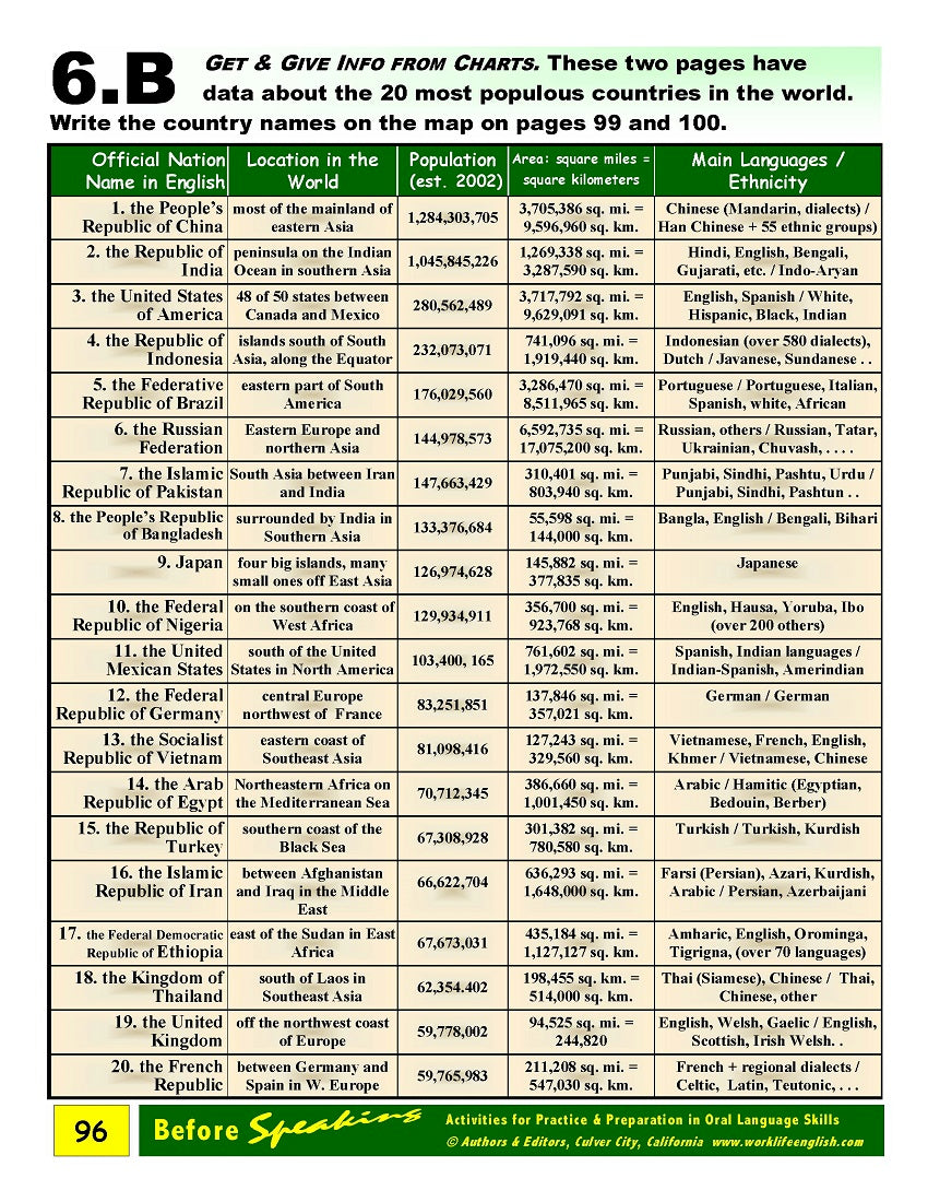 [1] After perusing Language Notes titled “Just the Facts,” Give & Get Info from Notes in Section 6.A. As you gain “expertise” in what there is to know and share about one of the U.S. states, you get to “teach” it with “Clarity & Understanding.” In 6.B, you can Get & Give Info (about Countries) from Charts,” organizing it (cooperatively) to answer questions and to fill in world maps. Use these techniques to collect and distribute info about other places in the world that interest you.