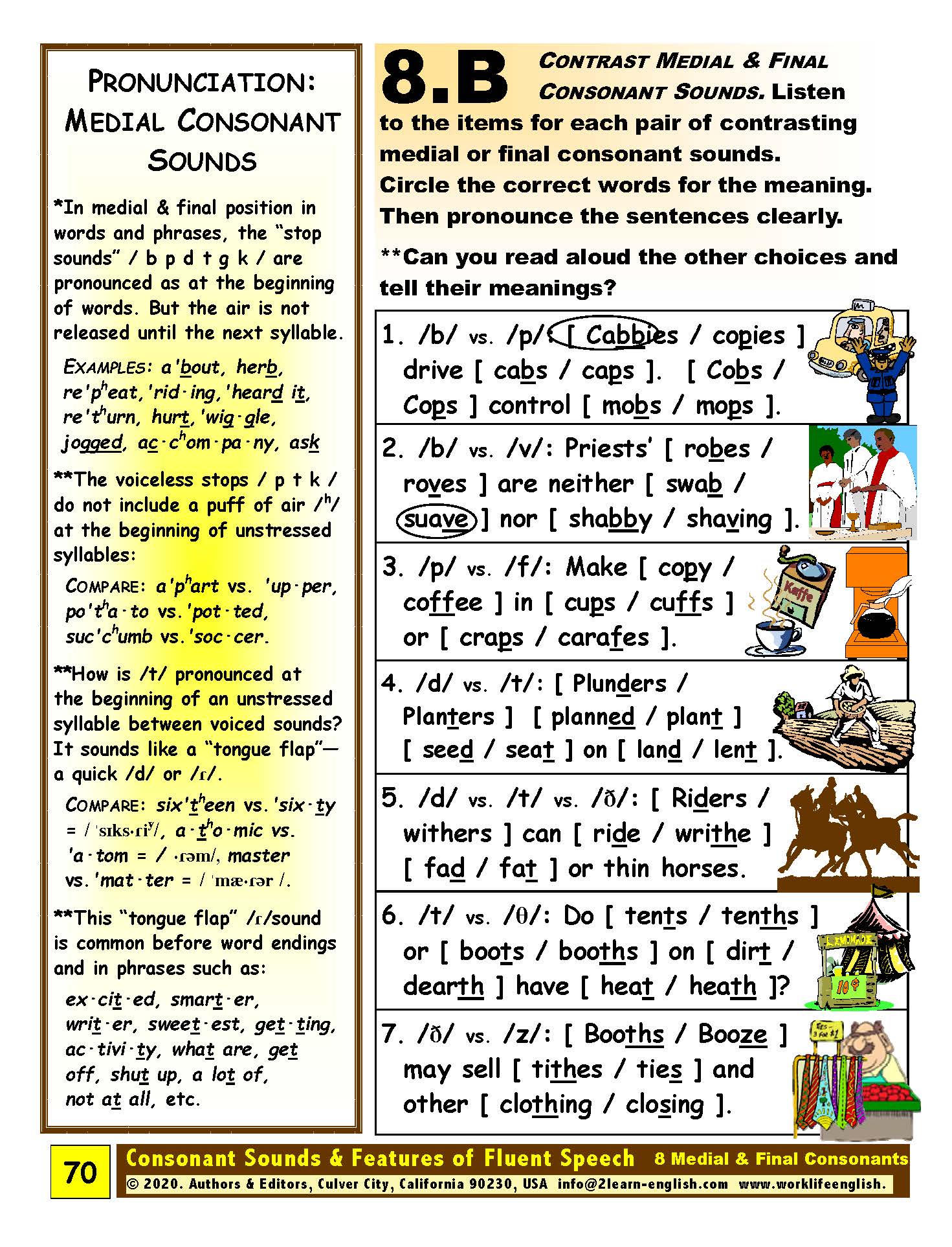 [1] Section 8-A offers examples of use of ten pairs of medial & final consonants to distinguish from one another (Examples: 'STA·ble vs. 'STA·ple, re'VIEWS vs. re'FUSE, PEAS vs. PEACE, and the like). It explains the nasal /N = ng/, Vowel Lengthening before Voiced Sounds, and possible Consonant Reductions. As text users read amusing phrases or sentences, they identify the underlined stops or continuants that differ from the other consonants.
