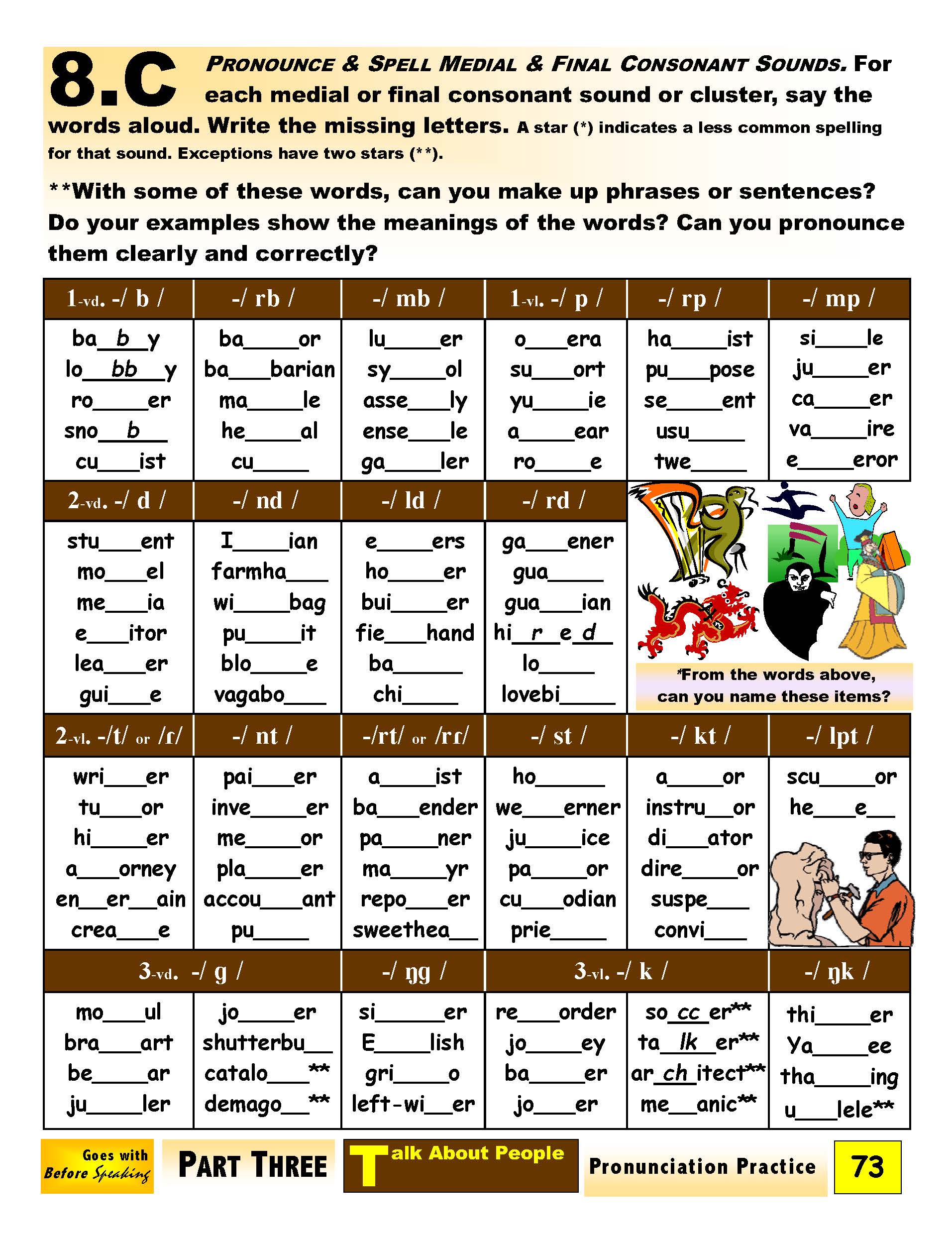 [2] In 8.B, they choose and pronounce correct words for each context. 8.C offers Columns with Pronunciation-Symbol headings: the words in each box call for letter-spellings to represent Consonant Sounds. The illustrated 8-D inspires learners to “Create Words with All Consonant Sounds.” The attached 7 pages from the Answer Key & Audioscript for Pronunciation Practice (Before Speaking) suggests even more vocabulary with the targeted sounds and sound blends.