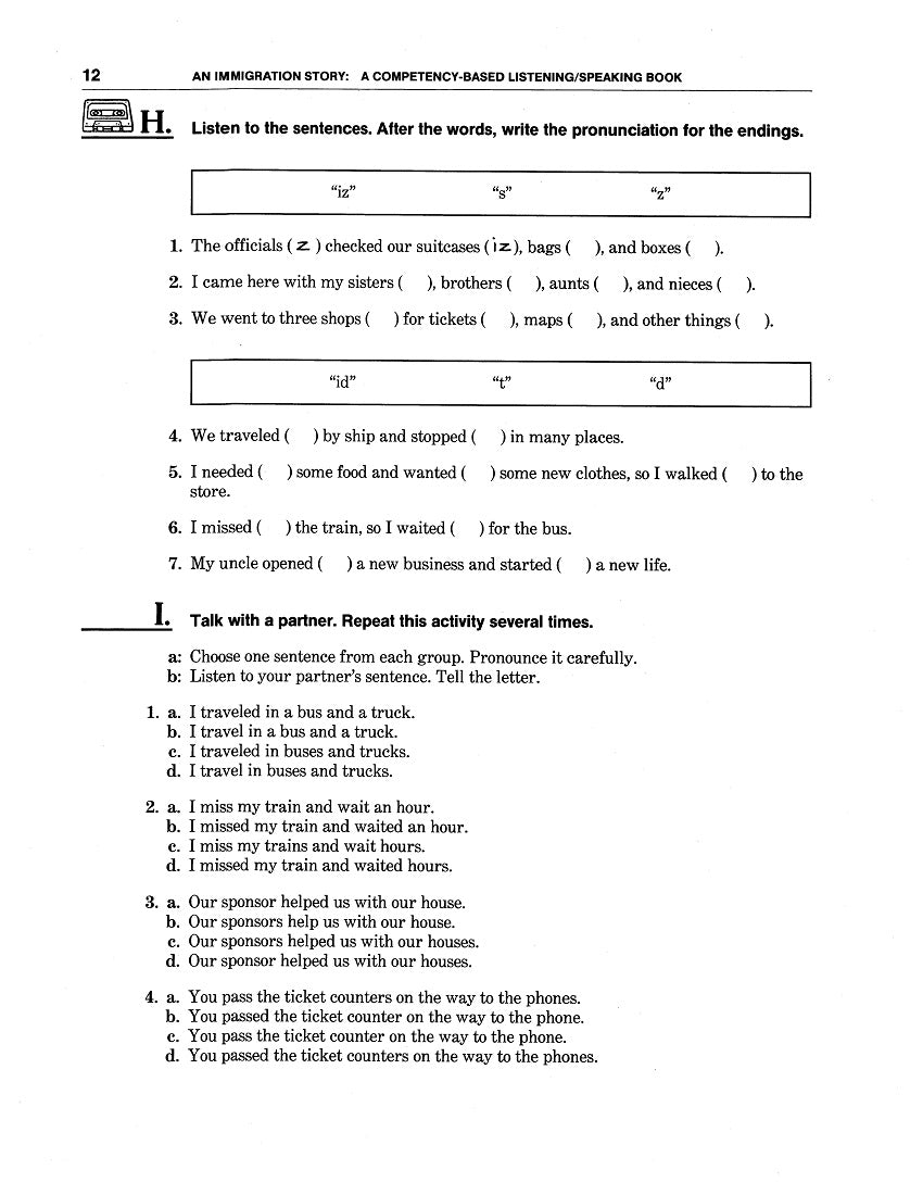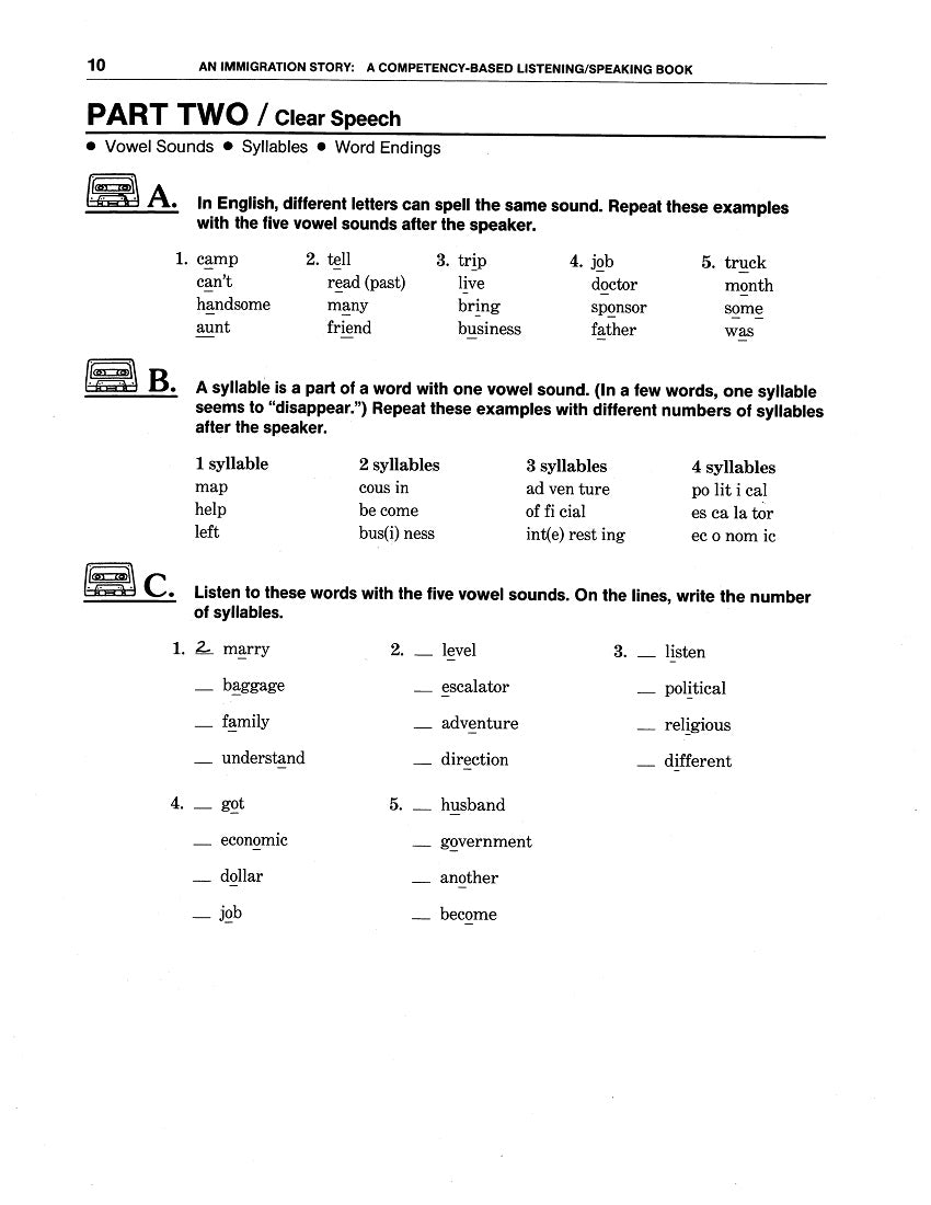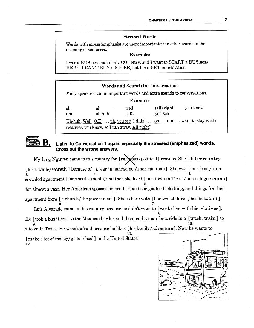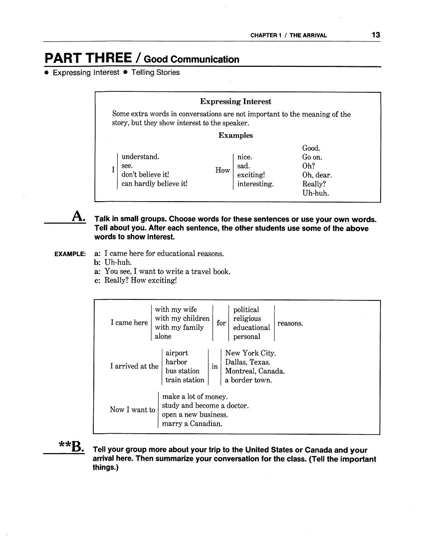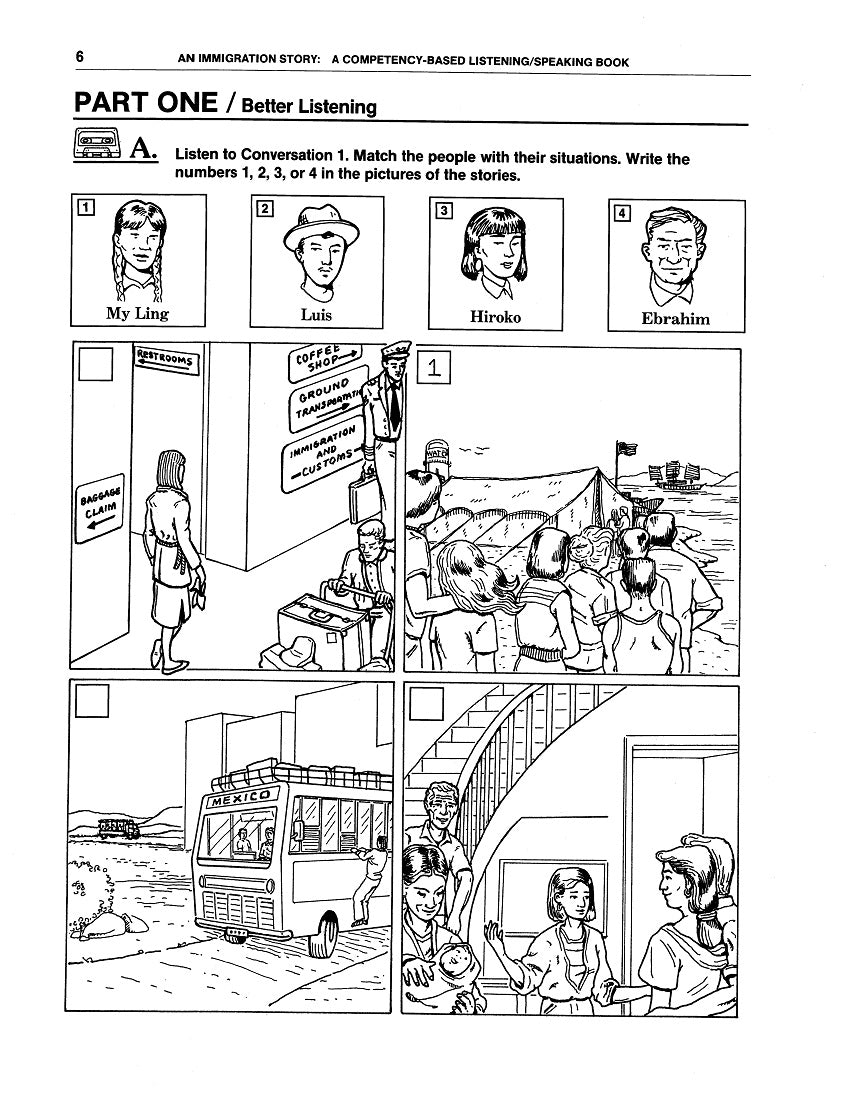 Why It’s Useful: All ten Chapters of WorkLife English: A Competency-Based Listening/Speaking Book 3: An Immigration Story have the same format—which differs from that of WLE: L/S 2 for variety—and because language learners are progressing in their abilities. After a Chapter Opener listing Competencies, Notions & Functions, Grammar comes Part One / Better Listening: it’s centered around thematic Immigration Stories of four “Principal Protagonists” in a fictional book-long narrative. For Pre-Listening, text users anticipate what they’re about to hear by answering predictive questions about four drawings; after a First Listening, they match the scenes to stories. During a Second Listening, they cross out the wrong words in a narrative, leaving the stressed ones to convey significant details. Later, they identify Reduced Forms, Contractions, and other “Function Words” not crucial to the Main Ideas but still helpful. Part Two / Clear Speech provides Pronunciation Practice in Sounds and other features. Part Three / Good Communication offers Notional / Functional Vocabulary as well as Sentence Templates to follow in “Telling Your Own Story.” And in Part Four / Practical Listening, there are short simulated segments relevant to the Chapter subject matter.