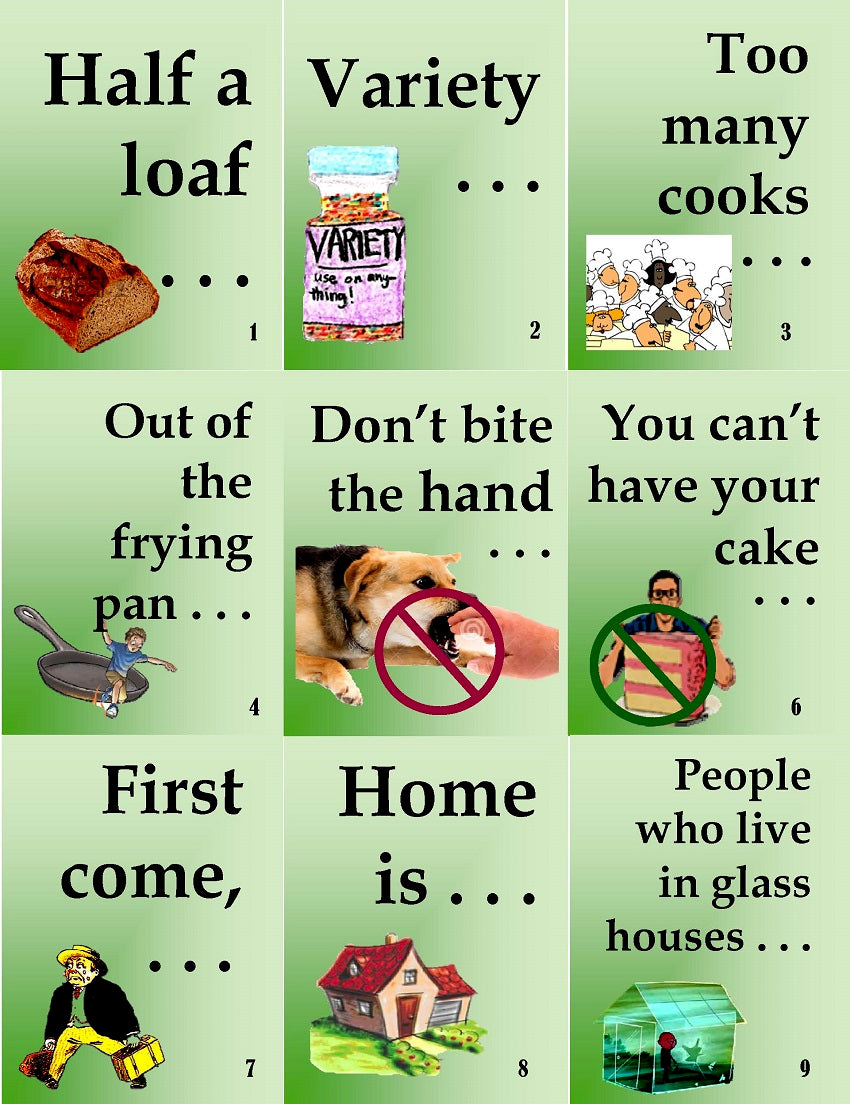 [1] Download (any even number of) the forty (40) pages of E-10.09a: Phrasing of Ninety Traditional English-Language Proverbs. Note that the illustrated items to read appear on even numbered pages 2, 4, 6, . . . 36, 38, 40. The odd-numbered pages in between (1, 3, 5, . . . 35, 37, 39) display corresponding Card Backs: their coloring and words indicate if they belong to Deck 1 (Proverbs 1-45) or Deck 2 (Proverbs 46-90)—and if the illustrated phrasing on each card face represents the Beginning or Ending of a recognizable saying. They’ll be most effective in use printed out back-to-back. To use the (up to) 90 Cards in hands-on activity, cut them apart. No matter how many items you use at one time, keep the Beginnings together with their corresponding Endings.