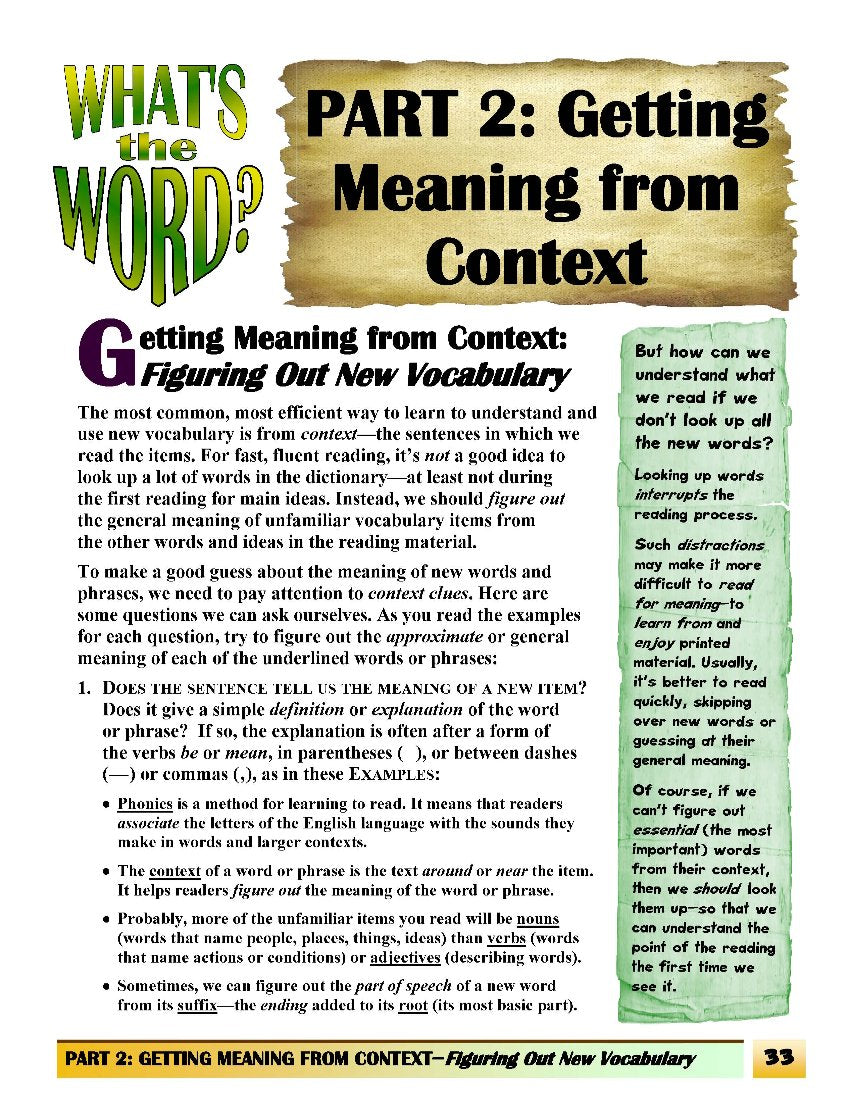 Why You Need Them: The most efficient way to understand new words and phrases is from their context—the frameworks in which they appear. Figuring out their general meaning is the best way to understand what you hear and read without interruption and with ease.