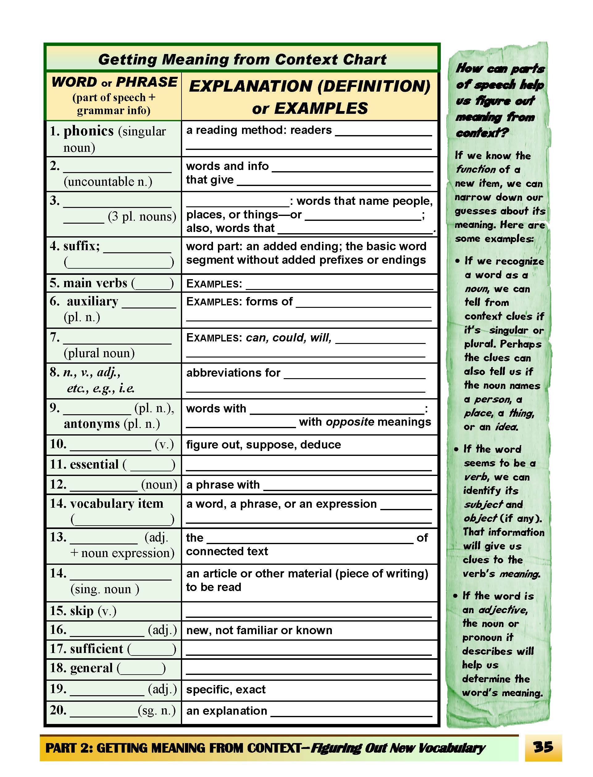 [1] Apply 3 kinds of context clues to make “educated guesses” about meaning. Complete a “Meaning-from-Context Chart.”