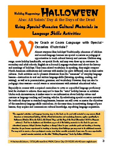 It's the generic concepts in this annoyingly long special-occasion How-to Teaching Resource that can fix the dilemma. With real information based on examples of an early but unofficial "holiday," Halloween & Related Occasions, it will help instructors to: