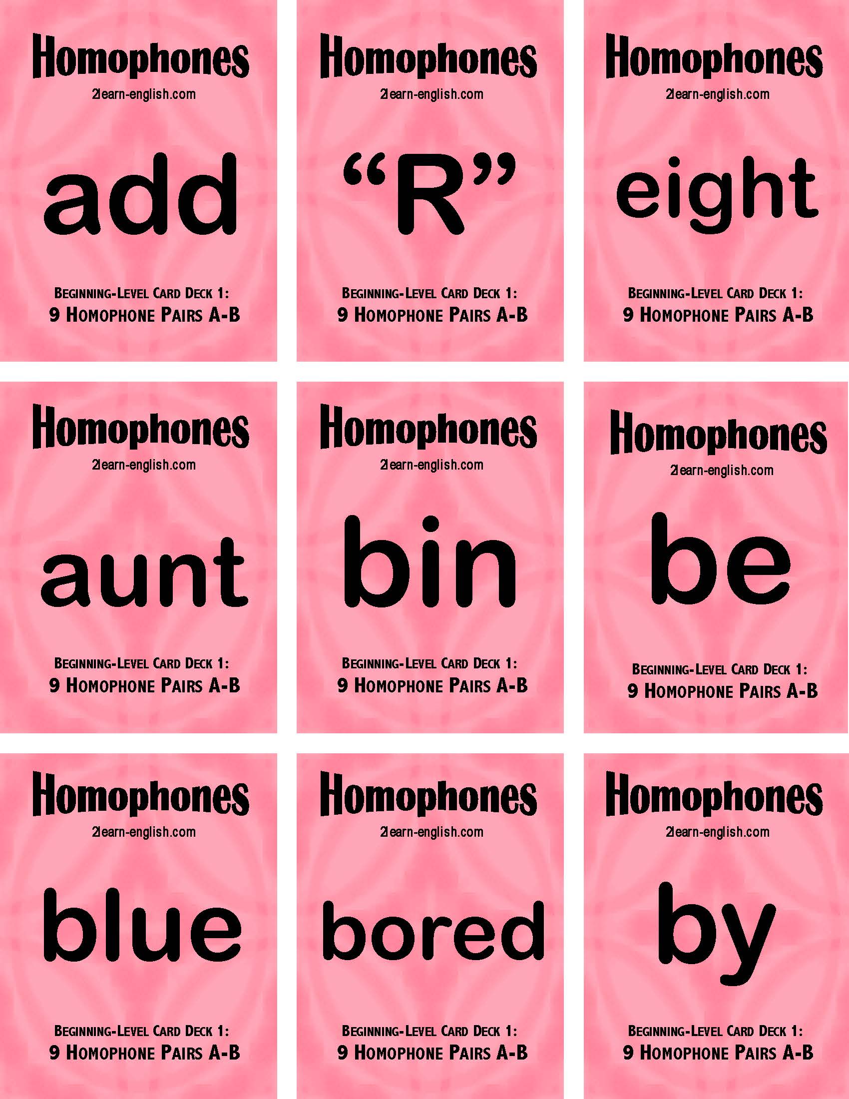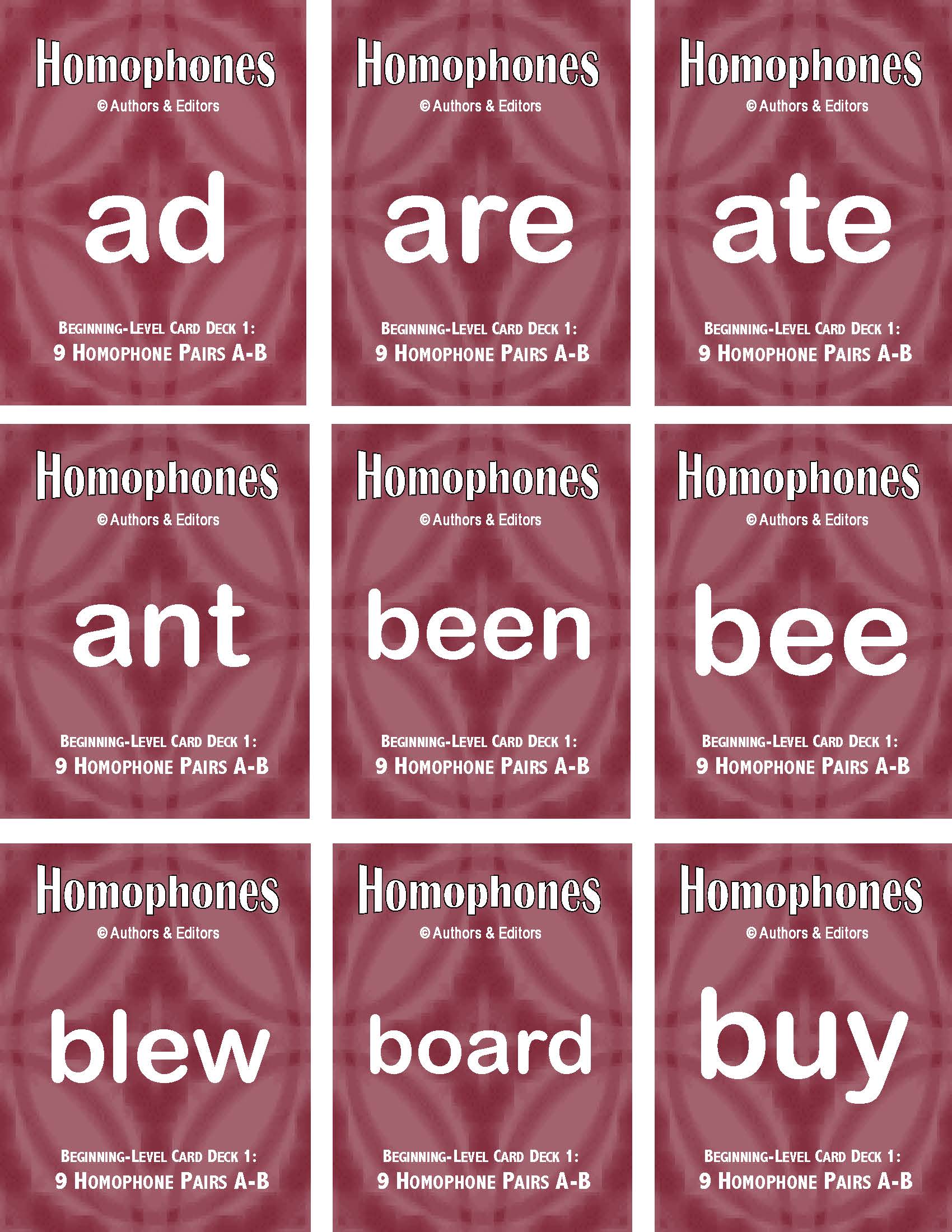 [1] From the Beginning Homophones Card Decks file, download all 24 pages to print out back-to-back, flipped horizontally. Cut apart the 108 two-sided cards so that they’re all the same size and shape. Note that they can be divided into 6 separate sets of 18 cards (9 matching pairs) each, arranged alphabetically.